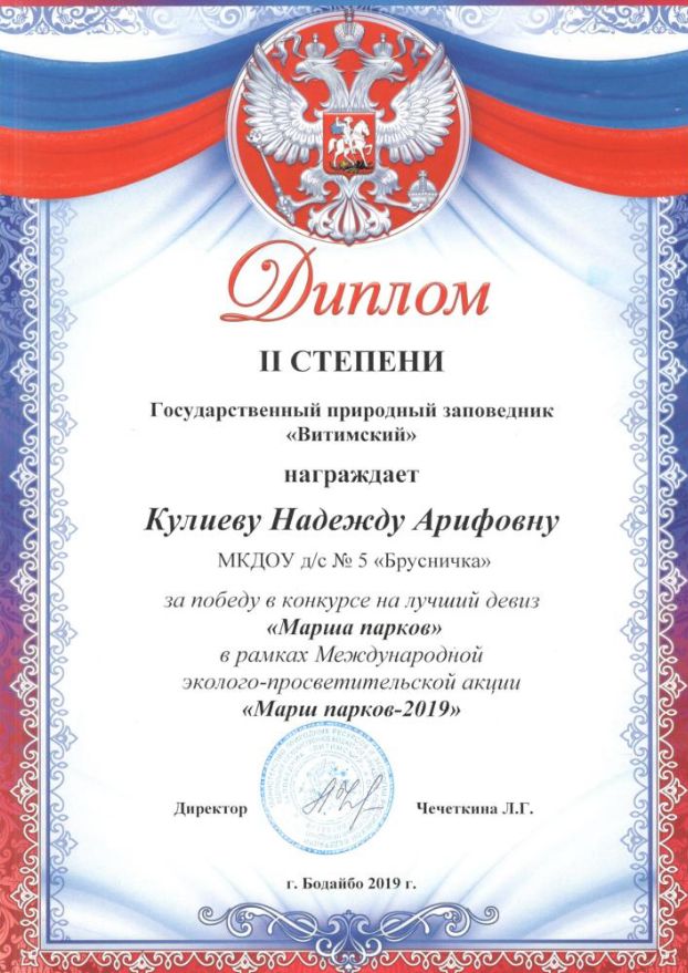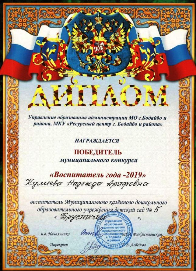Почетная грамота от управления образования администрации муниципального образования г. Бодайбо и района 2017г. |