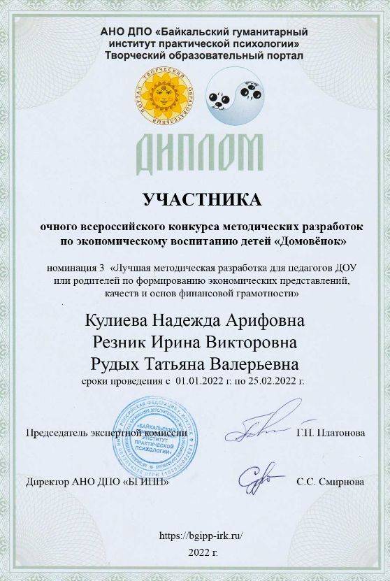 Всероссийский конкурс методических разработок по экономическому воспитанию детей "Домовёнок" |