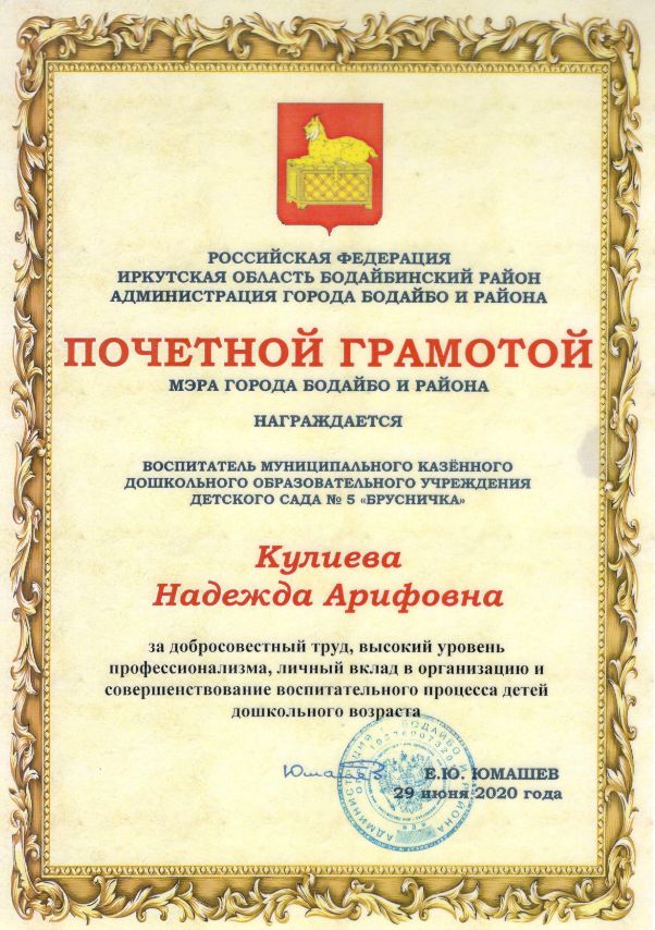 Почетная грамота мэра города Бодайбо и района 2020г. |