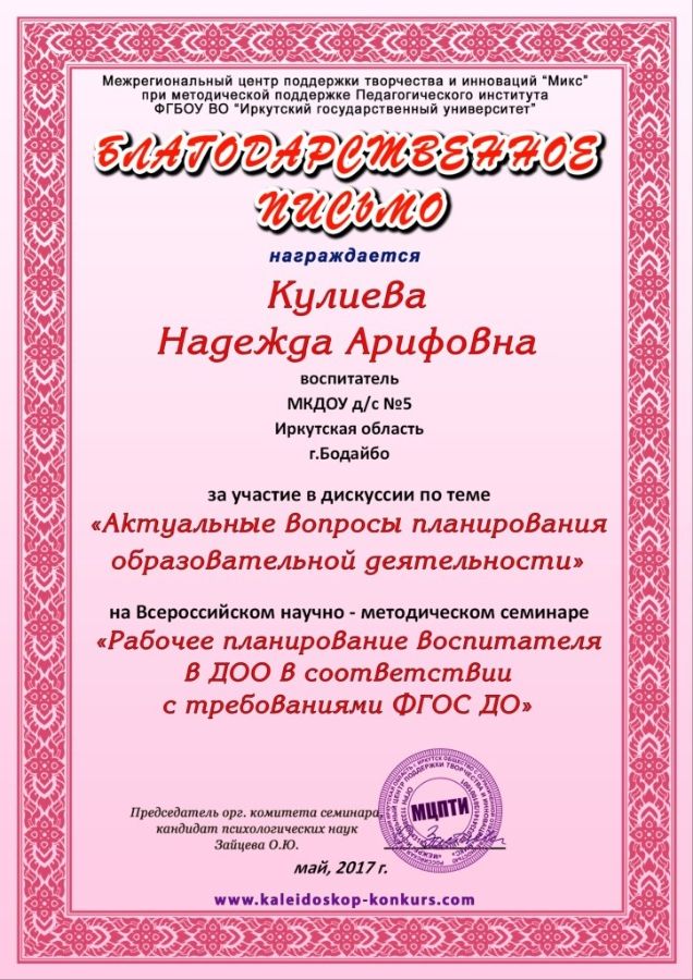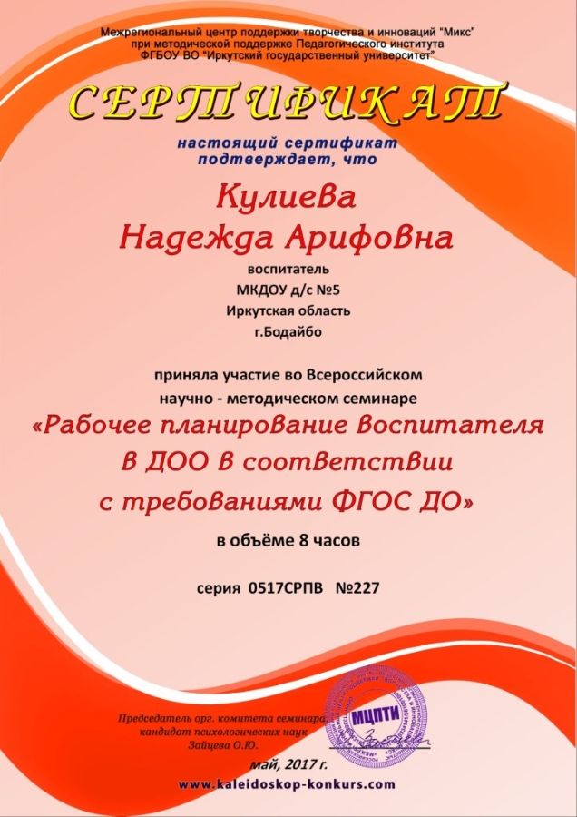 (Всероссийский научно-методический семинар) "Рабочее планирование воспитателя в ДОО в соответствии с требованиями ФГОС ДО" |
