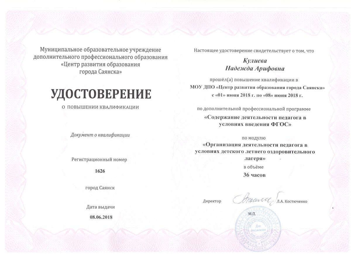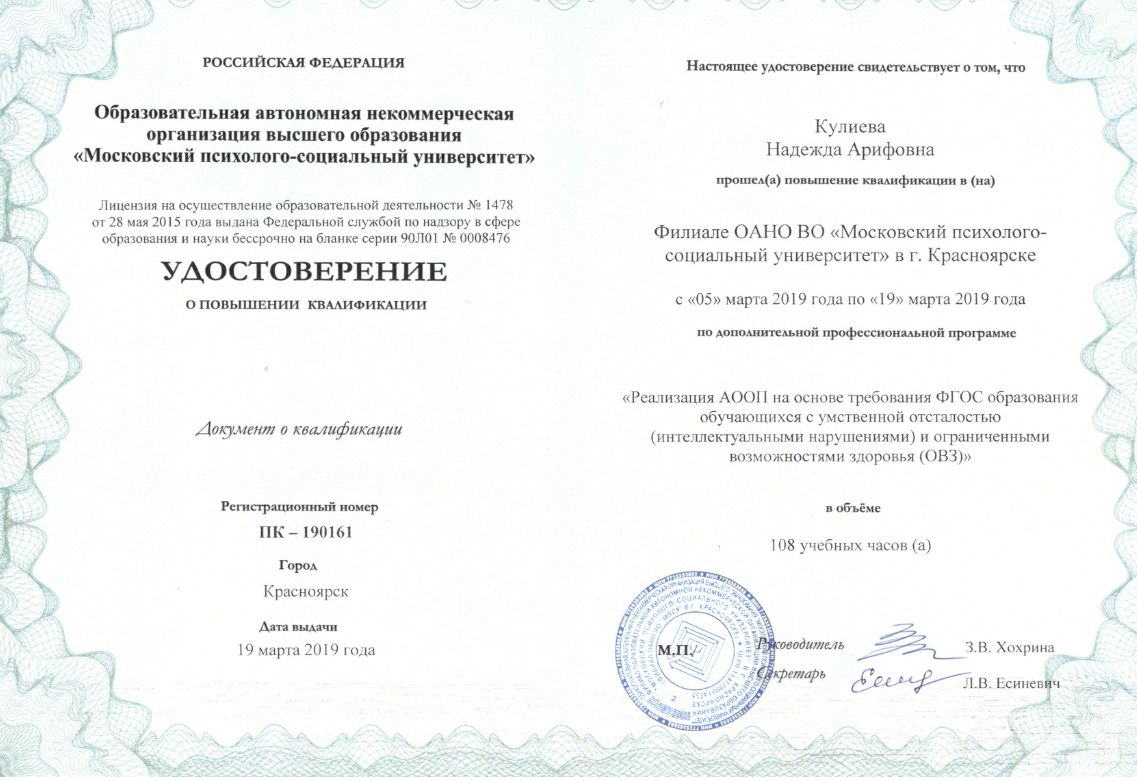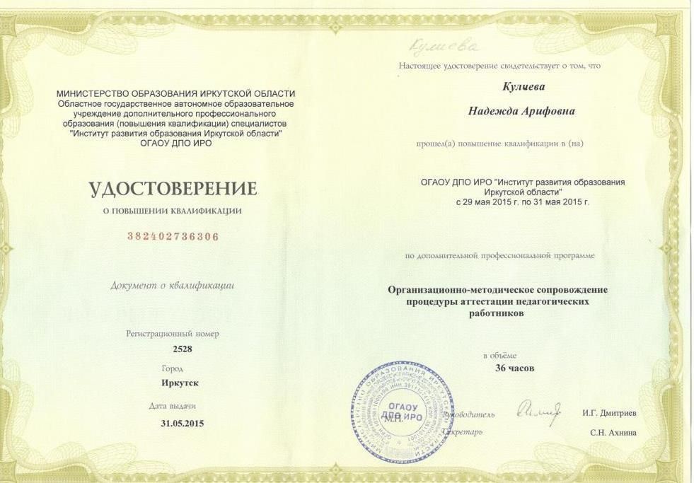 ФГБОУ ВПО "ВСГАО"г. Иркутск Диплом магистрапо направлению "Педагогическое образование" 2014г. |